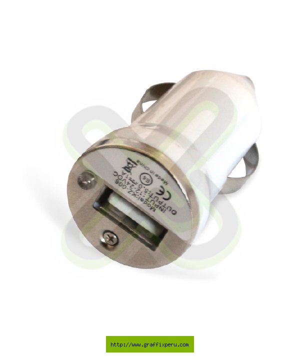 Descripción: CARGADOR USB PARA CARRO Tipo de impresión incluida: LOGO IMPRESO EN TAMPOGRAFIA UNA TINTA Colores: BLANCO Material: PLASTICO Medidas: 2.4 CM DE DIAMETRO X 5.5 CM Observaciones: CUERPO PLASTICO DE COLOR. DETALLES METALICOS. ADAPTADOR/CARGADOR PARA USB.