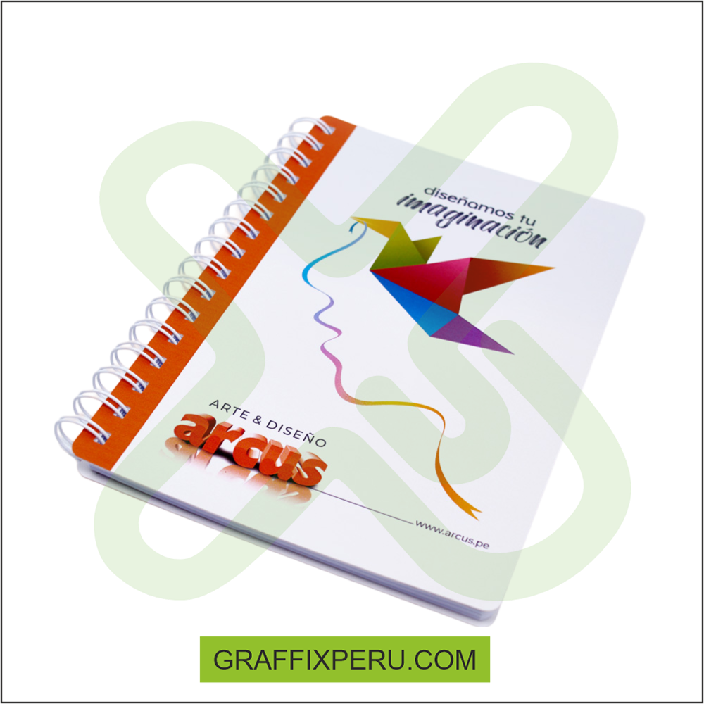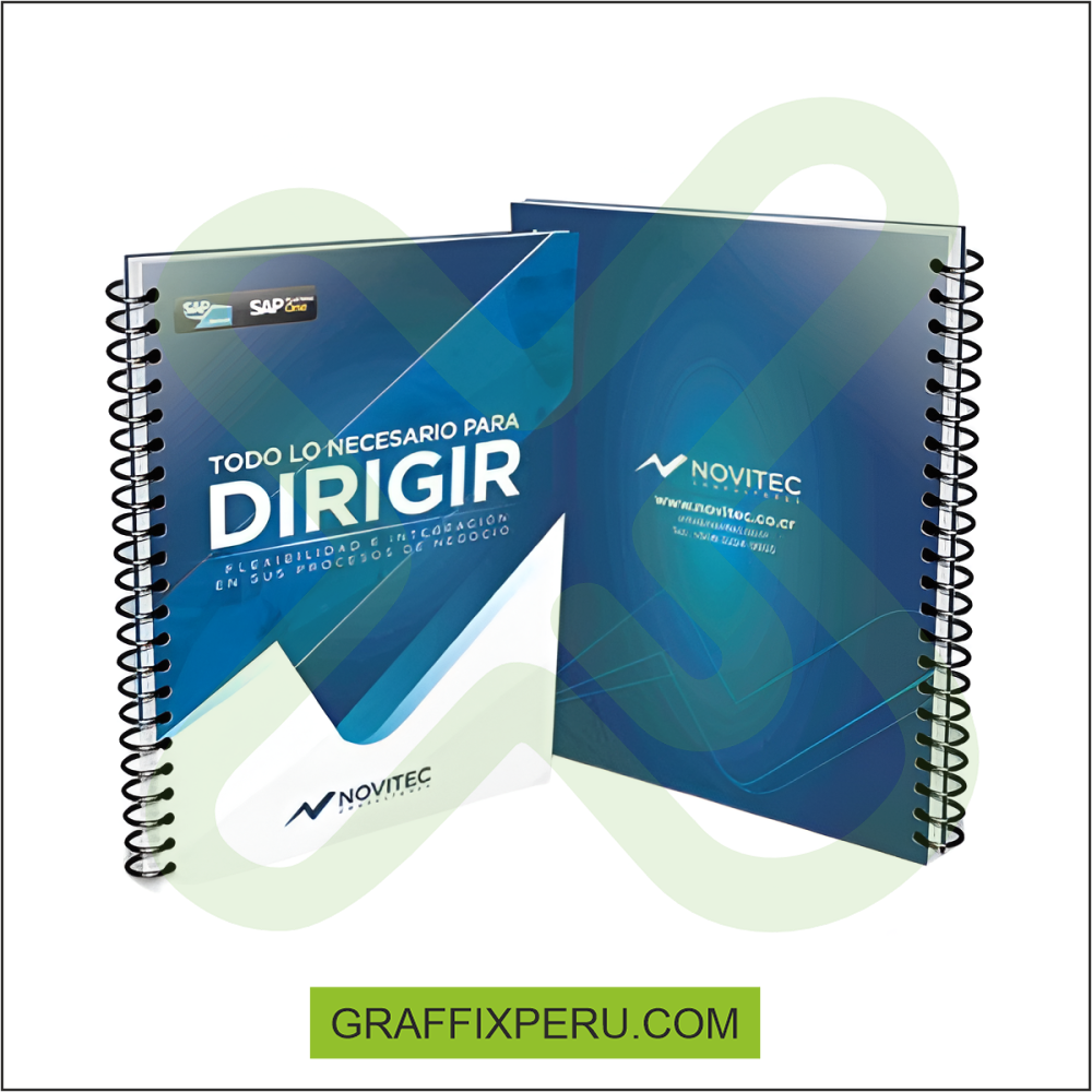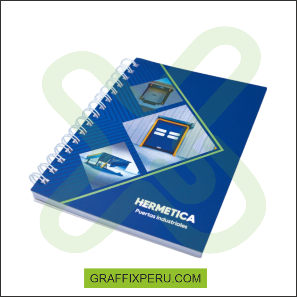 Cuaderno corporativos impreso a fullcolor tapa y contratapa dura + plastificado mate 01 hoja de datos anillado doble ring hojas internas 100 bond 75 gr cuadriculado / rayado insertos interiores a fullcolor tamaños: 15x 21 17 x 24 20 x 26 cm contamos con acabados especiales - hotstamping - sectorizado -repujado